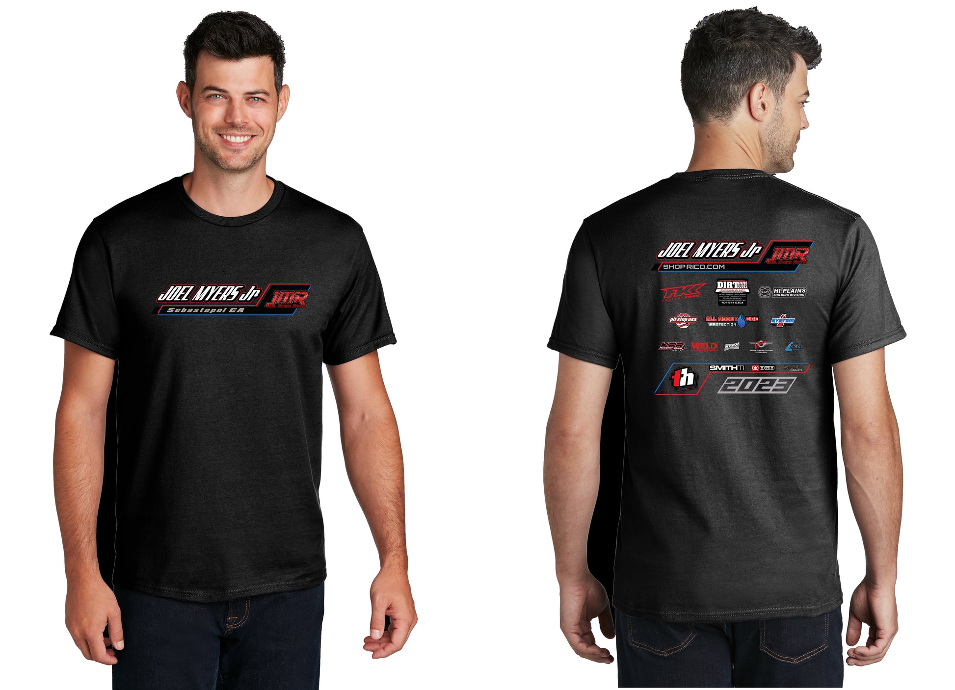 Black Short Sleeve T Shirt featuring Joel Myers Jr Logo on Chest and sponsor logos on back .